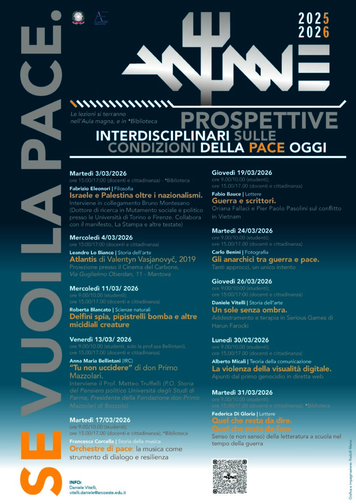 Tutti gli incontri previsti analizzeranno pace e guerra in maniera interdisciplinare rispettando due appuntamenti per ogni data, uno al mattino per gli studenti e uno dalle 15 alle 17 per i docenti e i cittadini, prenotabili gratuitamente online sul sito dell’Istituto.