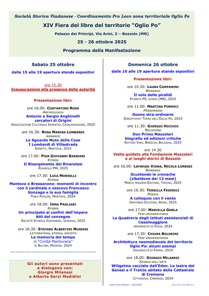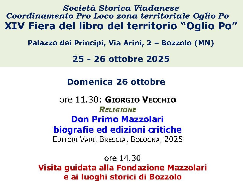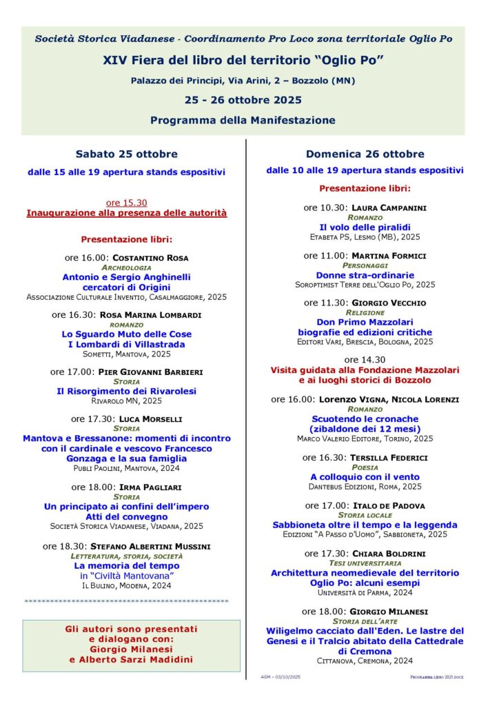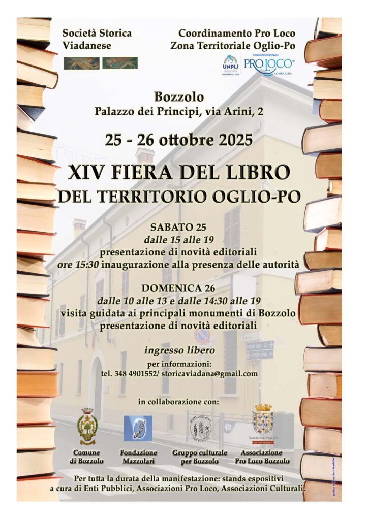 La Società Storica Viadanese e il Coordinamento Territoriale delle Pro Loco organizzano, per sabato 25 e domenica 26 ottobre, la XIV edizione della Fiera del Libro del Territorio Oglio-Po, che si svolge per la prima volta a Bozzolo, nello storico Palazzo dei Principi. L’iniziativa è realizzata con il supporto del Comune di Bozzolo, della Pro Loco, del Gruppo Culturale “Per Bozzolo” e della Fondazione Mazzolari.